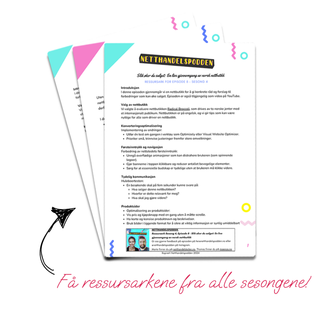 Marte Klouman og Thomas Moen gir råd og tips for å lykkes med netthandel i Norge. Hver episode inkluderer et ressursark med oppgaver, lenker og eksempler som hjelper deg å omsette kunnskapen til vekst i nettbutikken.Meld deg på og få de nyeste episodene rett i innboksen, og få tilgang til alle ressursarkene fra de fire siste sesongene.